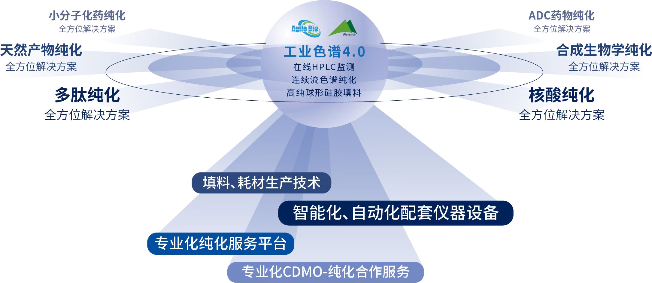 艾捷博雅致力于共同打造一个连续型、智能化的色谱纯化技术平台,一站式满足广大客户的相关设备、耗材以及服务需求。艾捷博雅推出工业色谱4.0技术平台,整合高纯球形硅胶制造技术、在线监控技术、连续流纯化技术这三大技术优势,为药企客户提供连续高效、高纯度、低成本的、环保低耗、稳定安全的连续制备色谱系统。